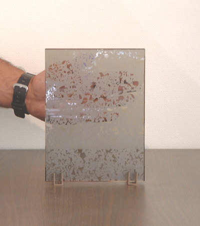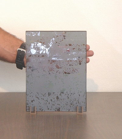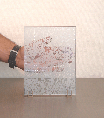 Frosted glass is typically clear glass which has been sandblasted on the outside surface, but any glass type can be treated with this process. As shown it offers the best obscurity. We offer a full family of design which can be processed as clear design on frosted glass, or frosted design on clear glass.
